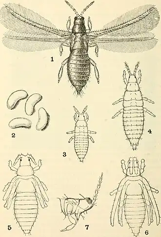 Esquema do ciclo de vida de Pear Thrips (Taeniothrips inconsequens (Uzel), tripes da sub-ordem Terebrantia): 1.adulto; 2.ovos; 3-4.larvas; 5-6: pupa; 7.visão lateral da cabeça.