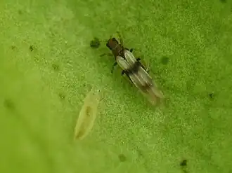 Adulto (escuro e com asas) e ninfa (claro e sem asas) de Thysanoptera.