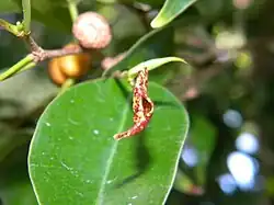 Cecídea em folha de Ficus causada por Thysanoptera.