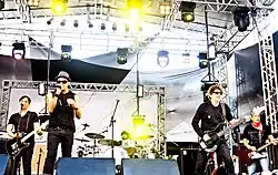 ![]() Titãs em 2018. Da esquerda para a direita: Branco Mello, Sérgio Britto e Tony Bellotto. | |