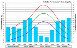 Toledo possui um clima semiárido frio (Köppen: BSk),[10] com invernos amenos e moderadamente secos, embora com alguns dias de chuva e verões quentes e secos. Temperaturas abaixo de 0 ºC são comuns durante a época mais fria do ano, mas não costumam ser inferiores a -5 ºC. O inverno e o verão são as estações mais secas do ano, enquanto que a primavera e o outono são as estações mais chuvosas. Durante o verão, temperaturas superiores a 35 ºC são comuns e durante as ondas de calor, as temperaturas podem ultrapassar os 40 ºC. Possui influências continentais, pois a sua amplitude térmica anual é superior a 20 ºC. A precipitação é baixa ao longo do ano, assim como muitas outras cidades da Castela-mancha.[10]