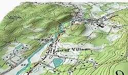 Parte do mesmo mapa topográfico anterior em perspetiva e alto relevo ilustrando como as linhas de contorno seguem o terreno.