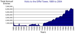 Localmente apelidada de "Dama de Ferro" (em francês: La dame de fer), foi construída de 1887 a 1889 como a peça central da Exposição Universal de 1889 e foi inicialmente criticada por alguns dos principais artistas e intelectuais franceses por seu design, mas tornou-se um ícone cultural global da França e uma das estruturas mais reconhecidas do mundo.[4] A Torre Eiffel é o monumento pago mais visitado do mundo; 6,91 milhões de pessoas subiram na torre em 2015. Foi designado um monumento histórico em 1964 e foi nomeado parte do Patrimônio Mundial pela UNESCO ("Paris, Margens do Sena") em 1991.[5]