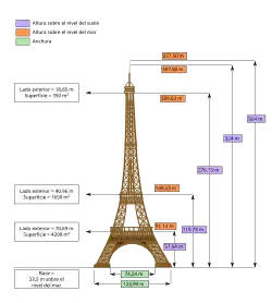A torre tem 330 metros de altura,[1] aproximadamente a mesma altura de um edifício de 110 andares, e é a estrutura mais alta de Paris. Sua base é quadrada, medindo 125 metros de cada lado. Durante sua construção, a Torre Eiffel ultrapassou o Monumento de Washington para se tornar a estrutura mais alta do mundo feita pelo homem, título que manteve por 41 anos até que o Edifício Chrysler em Nova York foi concluído em 1930. Foi a primeira estrutura do mundo a ultrapassar a marca dos 200 e 300 metros de altura. Devido à adição de uma antena de transmissão no topo da torre em 1957, agora ela é 5,2 metros mais alta que o Edifício Chrysler. Excluindo os transmissores, a Torre Eiffel é a segunda estrutura autônoma mais alta da França depois do Viaduto de Millau.