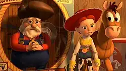 - Kelsey Grammer como Mineiro (em inglês, The Prospector), um boneco em forma de minerador idoso que, junto de Woody, Jessie e Bala no Alvo, está prestes a ser vendido para um museu japonês; ele passou a ter uma personalidade amarga após passar anos em uma prateleira de loja e vê no museu a única oportunidade de ser admirado em sua vida. Também conhecido como Pete Fedido (Stinky Pete, em inglês e PT-PT).[21] No Brasil, José Santa Cruz[28] e Pedro Pinheiro em Portugal.