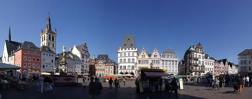 A Praça do Mercado (Hauptmarkt) de Tréveris, do século X, é uma das mais interessantes da Alemanha. A cruz do mercado (Marktkreuz), da mesma época, simboliza o direito de sediar feiras conquistado pela cidade. Hoje há uma cópia da cruz original assentada sobre uma coluna romana de granito, com relevo de Cordeiro de Deus. No sudeste da praça fica a Fonte de São Pedro (Petrusbrunnen), de 1595, com esculturas de São Pedro e das Quatro Virtudes.