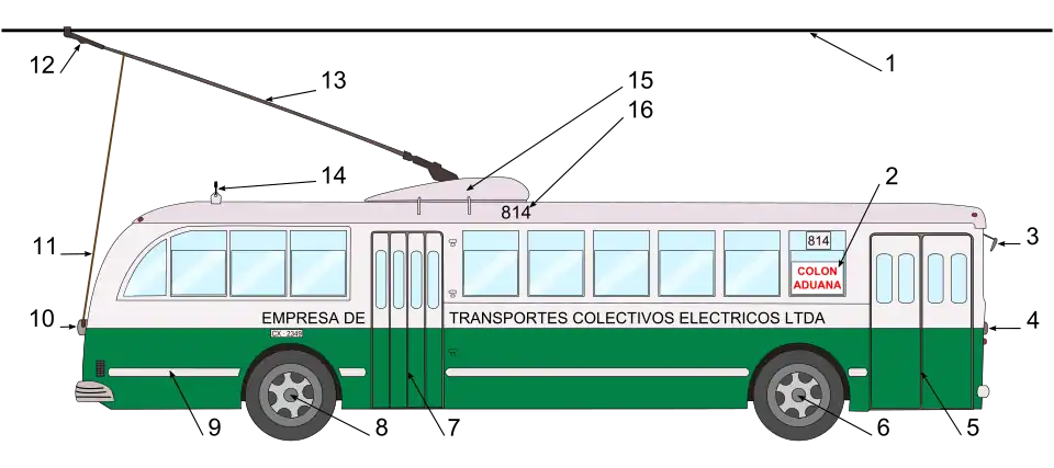 Esquema de um trólebus, mostrando neste caso um Pullman Standard 43-CX Nº 814.