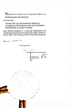Embora o tratado tenha sido assinado pelas duas Alemanhas independentemente, foi ratificado pela Alemanha reunificada.