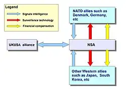 A montagem do sistema coincide com a construção da hegemonia norte-americana a partir da segunda metade do século XX, após a Segunda Guerra Mundial.[4] As organizações participantes, sob o comando da NSA são os serviços de informação dos estados membros do Acordo, a saber:[carece de fontes]