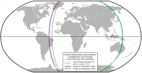 Inicialmente o meridiano de Tordesilhas não contornava o globo terrestre. Assim, Castela e Portugal podiam conquistar quaisquer novas terras que fossem os primeiros europeus a descobrir: Castela para Oeste do meridiano de Tordesilhas e Portugal para Leste desta linha, mesmo encontrando-se no outro lado do globo.[12][13] Mas a descoberta pelos portugueses em 1512 das valiosas "ilhas das Especiarias", as Molucas,[14][15] desencadeou a contestação espanhola, argumentando que o Tratado de Tordesilhas dividia o mundo em dois hemisférios equivalentes.