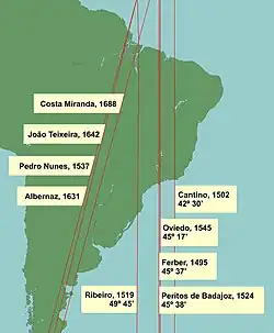 - ↑ Na zona das Ilhas Molucas. Sabe-se pela cartografia de hoje, que esse meridiano das Molucas é o 129°32' L, cujo antimeridiano, a 50°28'O, corta o território brasileiro.