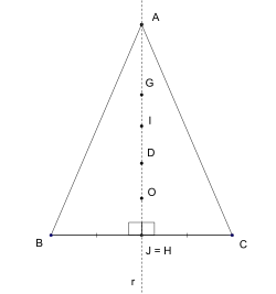 Primeiramente vamos provar que, se um triângulo é isósceles, então o baricentro, o incentro, o circuncentro e o ortocentro são colineares. Para demonstrar esse teorema partiremos do que foi demonstrado acima.