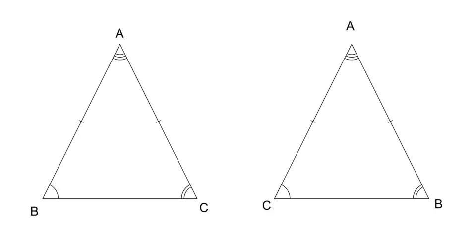 Todo triângulo isósceles é também um triângulo isoângulo, isto é, possui dois ângulos congruentes, que são os dois ângulos opostos aos lados congruentes. Chamamos esses ângulos de ângulos da base. Vamos demonstrar que para um triângulo ser isósceles basta ele possuir dois ângulo congruentes ou dois lados congruentes.