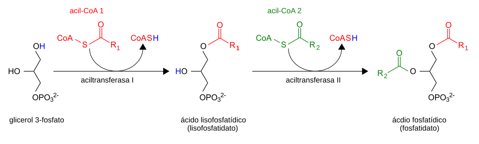 • Esterificação do glicerol com ácidos gordos. A glicerina intervém sob a forma de glicerol 3-fosfato, que pode ser obtido por fosforilação da glicerina ou a partir de di-hidroxiacetona-fosfato. A síntese de triacilglicerídeos propriamente dita consiste na acilação sucessiva do esqueleto do glicerol 3-fosfato nos seus três átomos de carbono. A primeira acilação, no carbono 1 (sn1), é catalisada pela enzima glicerol-fosfato-acil-transferase (GPAT) e resulta na formação de ácido lisofosfatídico. A segunda acilação (sn2) é catalisada pela enzima acil-glicerol-fosfato-acil-transferase (AGPAT), gerando ácido fosfatídico. De seguida, para que se forme o triacilglicerídeo, o ácido fosfatídico tem de perder o seu fosfato, dando origem a um diacilglicerídeo. Esta desfosforilação é catalisada por uma família de enzimas, as fosfatases do ácido fosfatídico (PPAPs em inglês), das quais as mais estudadas são as da família das lipinas. Por fim, a acilação na posição sn3 do diacilglicerídeo é catalisada pela enzima diacilglicerol-acil-transferase (DGAT). Tanto o ácido fosfatídico como o diacilglicerídeo são, além disso, precursores de outros glicerolípidos importantes: