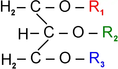 onde R, R' e R" são ácidos gordos. Os três ácidos gordos podem ser diferentes, todos iguais, ou dois iguais e o outro diferente. Podem ser saturados ou insaturados. Quando saturado, o triglicérido tende a ser uma gordura sólida a temperaturas ambiente moderadas, mas se contiver ácidos gordos saturados, tende a ser um óleo (líquido) a estas temperaturas. O comprimento das cadeias de ácidos gordos dos triacilglicerídeos varia entre 16 e 22 átomos de carbono.