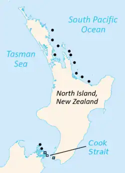 | Distribuição atual de Tuatara (em preto):[4][5] Os círculos representam as Tuatara da Ilha Norte e os quadrados as tuatara da Ilha dos Irmãos. Os símbolos podem representar até sete ilhas. | |