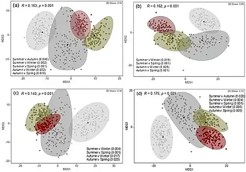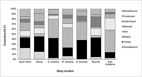 Retomando a discussão sobre a distinção sazonal da dieta do Galeocerdo cuvier, alguns testes foram feitos para compreender como ela se dá entre os tubarões-tigre sul-africanos. Apesar de ser observada certa sobreposição de espécies predadas, continua notória a distinção clara entre os padrões de alimentação no decorrer das estações do ano[21].