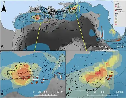 O gráfico KDE de densidade de probabilidade da presença de tubarões-tigre, por exemplo, demonstra que o padrão de movimentação/migração dos tubarões-tigre é altamente dependente de uma miríade de fatores. Alguns exemplos são sexo e idade, fora fatores ontogenéticos[19]. Portanto, tubarões machos juvenis têm padrões de movimentação drasticamente diferentes em relação aos de tubarões fêmeas adultas.