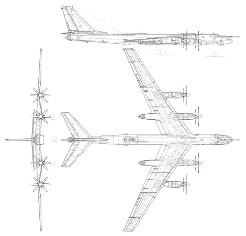 | Variantes | Tupolev Tu-114 transporte civil Tupolev Tu-142 patrulha marítima Tupolev Tu-95LAL propulsão nuclear | ||||||||||||||||||||||||||||||||||||||||||||||||