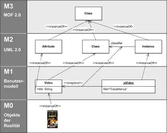 O exemplo mais proeminente de um modelo Meta-Object Facility da camada 2 é o metamodelo UML, que descreve a própria UML. Esses modelos M2 descrevem elementos da camada M1 e, portanto, modelos M1. Esses seriam, por exemplo, modelos escritos em UML. A última camada é a camada M0 ou camada de dados. É usado para descrever instâncias de tempo de execução do sistema.[9]