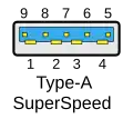 A especificação USB 3.0 definiu uma nova arquitetura e protocolo chamado SuperSpeed (também conhecido como SuperSpeed USB, comercializado como SS), que incluía uma nova faixa para um novo esquema de codificação de sinal (símbolos 8b/10b, 5 Gbit/s; também conhecido como Gen 1), fornecendo transferências de dados full-duplex que fisicamente exigiam cinco fios e pinos adicionais, preservando a arquitetura e os protocolos USB 2.0 e, portanto, mantendo os quatro pinos/fios originais para a compatibilidade com versões anteriores do USB 2.0, resultando em 9 fios (com 9 ou 10 pinos nas interfaces do conector; o pino ID não é conectado) no total.