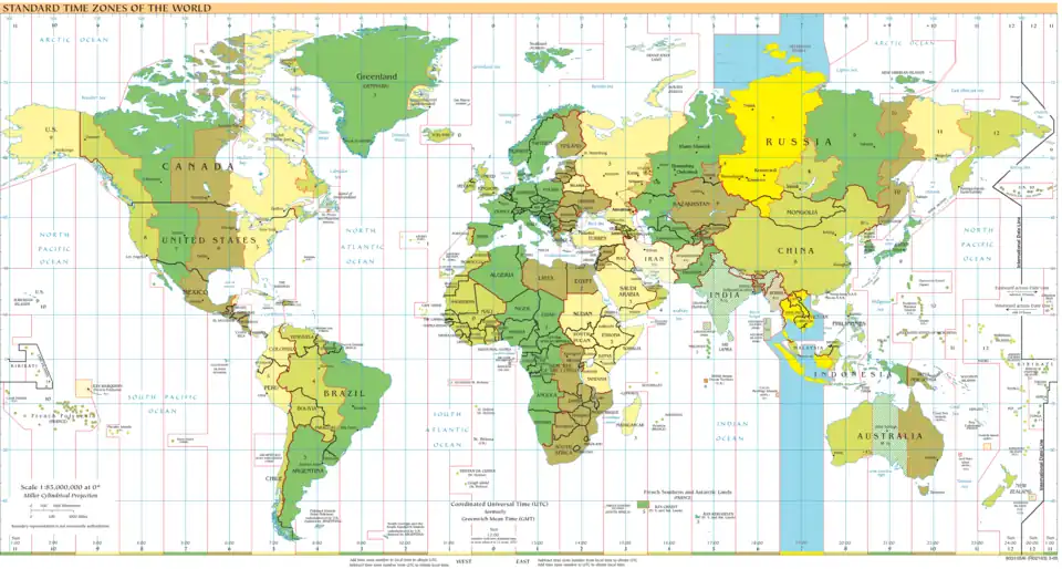 Mapa contendo as variações de tempo de acordo com a longitude, com a UTC+7:00 em destaque