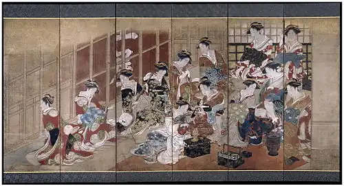 Utamaro (c. 1753 – 1806) conquistou grande renome na década de 1790 com seu bijin ōkubi-e ("retratos de belas mulheres com cabeça grande"), focando nas cabeças e na parte superior do tronco das figuras, estilo esse então já empregado em retratos de atores de kabuki.[64] Utamaro experimentou com traços, cores e técnicas para criar inovações em características físicas, expressões e fundos de temas a partir de uma vasta variedade de influências. As belezas individualizadas de Utamaro possuíam nítido contraste com as imagens estereotípicas que até então eram usuais.[65] Ao fim da década, especialmente após a morte de seu patrono, Tsutaya Jūzaburō, em 1797, a prodigiosa produtividade de Utamaro decaiu em qualidade[66] e assim continuou até sua morte, em 1806.[67]
