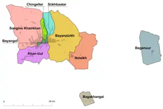 Ulã Bator está dividida em nove distritos (düüregs): Baganuur, Bagakhangai, Bayangol, Bayanzurkh, Chingeltei, Khan Uul, Nalaikh, Songino Khairkhan e Sükhbaatar.