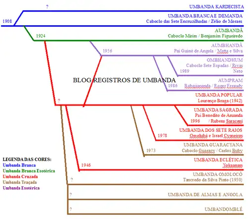 - ↑ Fernandes, Saulo Conde (2014). «Entre linhas e falanges: a diversidade da Umbanda na contemporaneidade». Núcleo de Estudos Interdisciplinares sobre Psicoativos