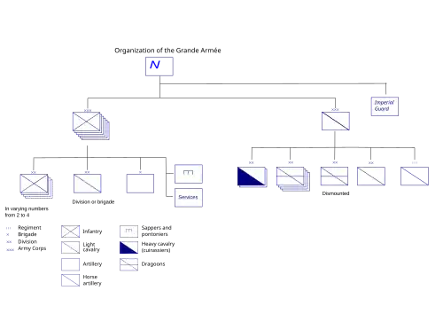 Quando foi organizado, o Grande Armée (Grande Exército) estruturava-se segundo uma orgânica bem precisa que incluía sete corpos de exército, em cada um dos quais estavam presentes as armas de infantaria, de cavalaria e de artilharia. Assim, cada corpo de exercito incluía entre duas e quatro divisões de infantaria, uma divisão ou brigada de cavalaria ligeira e seis baterias de artilharia. Além destes corpos, ainda existia o corpo de cavalaria de reserva composto por duas divisões de couraceiros, cinco divisões de dragões (um das quais apeada), uma divisão de cavalaria ligeira e quatro batarias a cavalo. A estas unidades, ainda se ajuntavam várias unidades da Guarda de efetivo variável.