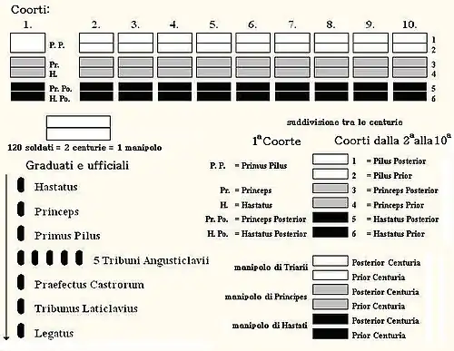 Enquanto no Mediterrâneo oriental as unidades militares evoluíram segundo aqueles canónes, na Península Italiana, a evolução ocorria sob o impulso de Roma. Nas Guerras Samnitas, os romanos tinham já apreciado a facilidade com a qual os Samnitas foram capazes de se organizar em terrenos difíceis, graças à sua capacidade de operar pequenas unidades independentes, como no famoso episódio da Batalha das Forcas Caudinas onde os romanos sofreram uma pesada derrota em virtude da maior flexibilidade das unidades samnitas. A necessidade de operar com formações menos cerradas que as das falanges, forçou os romanos a alterar a estrutura do seu Exército, organizando-o em legiões de cerca de 4 000 homens, divididas em quatro linhas, das quais as primeiras três já não estavam armadas com uma longa lança, mas sim com um dardo (pilo) que era lançado na primeira fase do combate e com uma espada (gládio) para as fase seguinte em que se combatia corpo a corpo. Somente a quarta linha (triários, com cerca de 1200 soldados) se manteve armada com lança, sendo utilizada como reserva tática para romper definitivamente a frente inimiga ou como cobertura em caso de retirada da legião. Assim, na legião inicial da República Romana, menos de um terço dos soldados estava armado de pique, estando a maioria deles armado apenas de gládio e dardo ligeiro (vélites) ou de gládio e pilo (hastados e príncipes). O facto revolucionário em tudo isto foi a divisão de todos os escalões de infantaria pesada em dez manípulos, que dispondo-se em quincôncio, permitia um apoio recíproco, fazendo avançar e retroceder hastados e príncipes à medida das necessidades táticas. A legião, enquanto grande unidade de armas combinadas, dispunham já de um contingente de cavalaria (alas) e contingentes especializados de aliados (sócios).