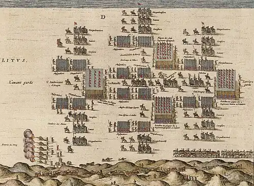A um nível superior, os exércitos em campanha — que na época dispunham de um reduzido número de efetivos — dividiam-se grosseiramente na vanguarda, no centro e na retaguarda que, em combate, se desdobravam, respetivamente, na ala direita, no centro e na ala esquerda. A vanguarda e a retaguarda dispunham dos seus próprios comandantes, ambos subordinados ao general chefe do exército, que também tinha a seu cargo o comando direto do centro. As três forças operavam com distâncias mínimas entre elas, de modo a poderem ser controladas conjuntamente pelo general do exército e a poderem apoiar-se mutuamente.