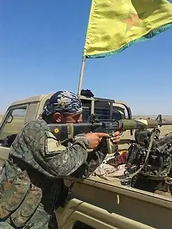 | Lema | em curdo: YPG dimeşe, erd û ezman diheje (O YPG está marchando, e a terra e os céus tremem) |