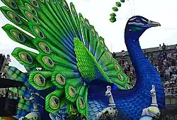 O pavão, símbolo da Tijuca, no carro abre-alas do carnaval de 2019.