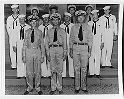 Por terem sido tão essenciais para o sucesso das missões no Pacífico durante a guerra, a Marinha não divulgou a existência das UDT até ao pós-guerra.[63] Durante a Segunda Guerra Mundial, a Marinha não tinha classificação para os UDTs nem insígnia. Aqueles homens com a classificação CB em seus uniformes consideravam-se Seabees que estavam fazendo demolições subaquáticas. Eles não se autodenominavam "UDTs" ou "Homens-rãs", mas sim "Demolidores", que foram herdados dos NCDUs,[64] e os esforços de recrutamento do Tenente Kauffman na escola de dinamitação e demolição Seabee. O segundo maior grupo de voluntários da UDT veio da escola conjunta de Scouts and Raiders do Exército-Marinha, que também ficava em Fort Pierce, e da escola de eliminação de bombas da Marinha nas equipes dominadas pelos Seabee.