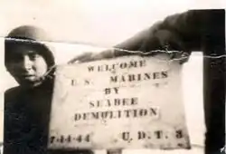 Sendo as primeiras a efetuar frequentemente aterragens anfíbias, as UDT começaram a fazer sinais de boas-vindas aos fuzileiros navais, indicando que tinham estado lá primeiro, para fomentar a continuação da rivalidade amigável. Mantendo a tradição da UDT, a UDT 21 criou uma placa para saudar os fuzileiros navais que desembarcam no Japão. Para a Operação Beleaguer, o UDT 9 foi implantado com o III Corpo Anfíbio no Norte da China. Em 1965, a UDT 12 colocou outra placa na praia para saudar os fuzileiros navais em Da Nang.
