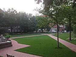 Praça da Universidade com o Corcoran Hall à esquerda e a faculdade de Mídia e Relações Públicas à direita.