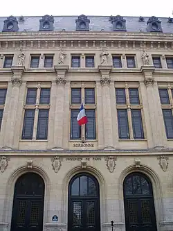 Os principais prédios da universidade, apesar de não serem contíguos, têm por centro o edifício da Sorbonne. Esta, originária de uma escola fundada pelo teólogo Robert de Sorbón ao redor de 1257, foi o mais famoso colégio de Paris. Sua proximidade da faculdade de estudos teológicos, e o uso do seu auditório para grandes debates, fez o nome Sorbonne tornar-se a designação popular para a faculdade de teologia de Paris.