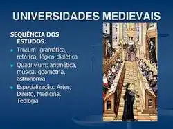 As primeiras universidades da Europa foram fundadas na Itália e na França, em que vieram das escolas catedrais, ou seja, fundadas pela Igreja Católica. A parte central do ensino envolvia o estudo das artes preparatórias, ou artes liberais; o trivium (trívio): gramática, retórica e lógica; e do quadrivium (quadrívio) : aritmética, geometria, música e astronomia. Depois disso, o aluno podia realizar os estudos mais específicos, que eram originalmente as 4 disciplinas: direito, medicina, teologia e filosofia[1]. As mulheres não eram voltadas para essa educação, com exceção de algumas que muito influenciaram sua época, tal como Cristina de Pisano e Hildegarda de Bingen. Ao que parece, muitos estudantes universitários medievais proviam de famílias de poucas posses e de classe baixa. Haviam também frades entre os estudantes, homens que desejavam simplesmente ampliar seus conhecimentos e promover virtudes intelectuais, ou contavam com o patrocínio de um superior eclesiástico. [2]