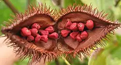 Fruto aberto de urucu mostrando as sementes cobertas pelo arilo avermelhado utilizado como corante e tintura.