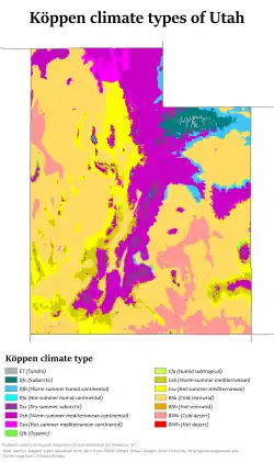 Mapa climático de Utah segundo a classificação climática de Köppen.