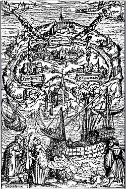 ![]() Xilogravura por Ambrosius Holbein de uma edição de 1518 de Utopia | |