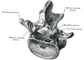 A vértebra lombar é composta, anteriormente, por um amplo corpo vertebral, com suas faces superior e inferior; posteriormente, por um processo espinhoso único; e, lateralmente, por processos transversos, que são projeções laterais, à direita e à esquerda, do ponto de união do pedículo com a lâmina. Longitudinalmente à vértebra, há os processos articulares, os quais são em número de quatro: dois superiores e dois inferiores, sendo saliências que se destinam à articulação das vértebras entre si, a partir de faces articulares. Por fim, há lateralmente, nos arcos, os pedículos do arco vertebral, que são partes mais delgadas em que repousam as estruturas vasculonervosas. Como consequência da disposição dessas estruturas, cria-se o forame vertebral medialmente a tudo, por onde passará a medula espinhal.