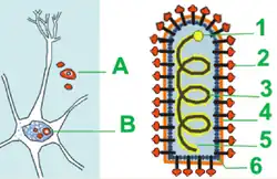 O revestimento lipídico (4, na imagem) é cercado por uma camada de espículos de glicoproteína, com cerca de 5 a 10 nm de comprimento[1] (2, na imagem). O nucleocapsídeo tem formato helicoidal simétrico (3) e é envolvido por uma camada lipídica (5).[1]
