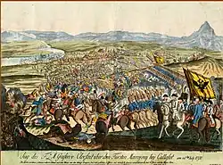 À medida que todos os Bálcãs se tornaram parte integrante do crescente Império Otomano (um processo que terminou com a queda de Constantinopla para o sultão Maomé II, o Conquistador em 1453), a Valáquia se envolveu em confrontos frequentes nos anos finais do reinado de Mircea I (r. 1386–1418). Mircea derrotou inicialmente os otomanos em várias batalhas, incluindo a Batalha de Rovine em 1394, expulsando-os de Dobruja e estendendo brevemente seu governo ao Delta do Danúbio, Dobruja e Silistra (c. 1400–1404). [30] Ele oscilou entre alianças com Sigismundo, Sacro Imperador Romano, e a Coroa do Reino da Polônia (participando da Batalha de Nicópolis), [31] e aceitou um tratado de paz com os otomanos em 1417, depois que Maomé I assumiu o controle de Turnu Măgurele e Giurgiu. [32] Os dois portos permaneceram parte do estado otomano, com breves interrupções, até 1829. Em 1418-1420, Miguel I derrotou os otomanos em Severin, apenas para ser morto em batalha pela contra-ofensiva; em 1422, o perigo foi evitado por um curto período quando Dan II infligiu uma derrota a Murade II com a ajuda de Pippo Spano. [33]