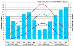 O clima de Valladolid pode ser definido como mediterrâneo continental. Os invernos são frios com geadas frequentes e neve ocasional. Os verões são quentes e secos com temperaturas máximas que muitas vezes superam os 35 °C. As precipitações são escassas.