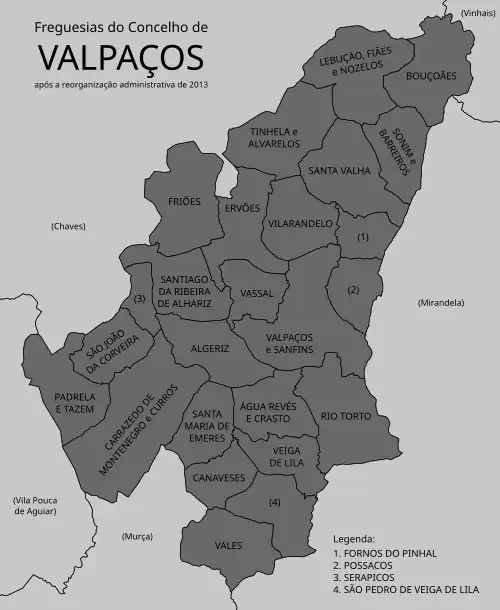 Desde a reorganização administrativa de 2012/2013,[16] o município de Valpaços está dividido em 25 freguesias: