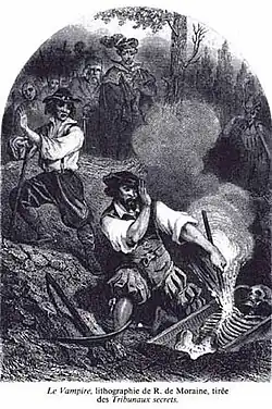 Le Vampire, litografia de R. de Moraine em Féval (1851-1852) mostrando moradores queimando o esqueleto exumado de um suposto vampiro.
