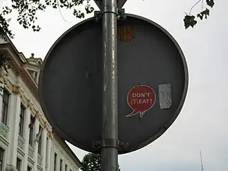 Adesivo com a frase "don't meat!" (traduzido do inglês, "não coma carne!") em rua de Barcelona. A letra "M" da palavra "meat" faz referência ao logotipo do McDonald's.