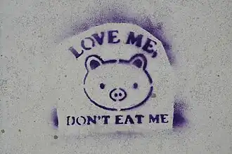 Pintura pró-vegetarianismo em rua de Le Mans (traduzida do inglês, "ame-me, não me coma").